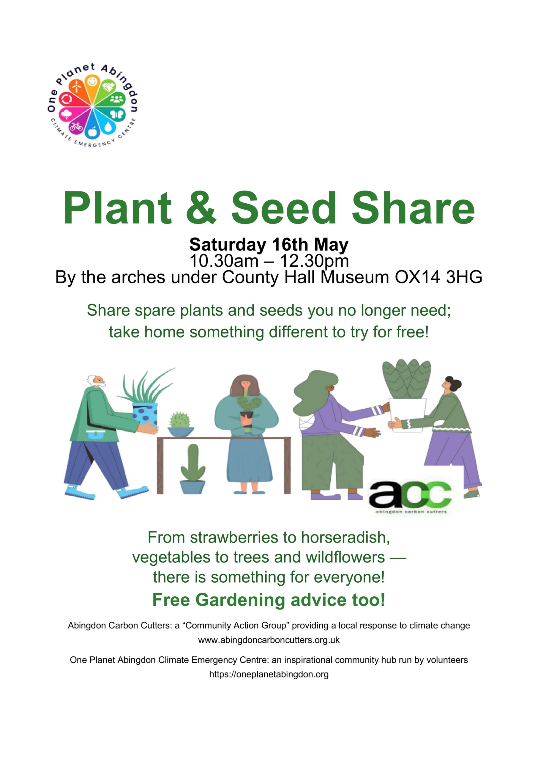 Share spare plants and seeds you no longer need; take home something different to try for free! From strawberries to horseradish, vegetables to trees and wildflowers — there is something for everyone! Free Gardening advice too! By the arches under County Hall Museum OX14 3HG